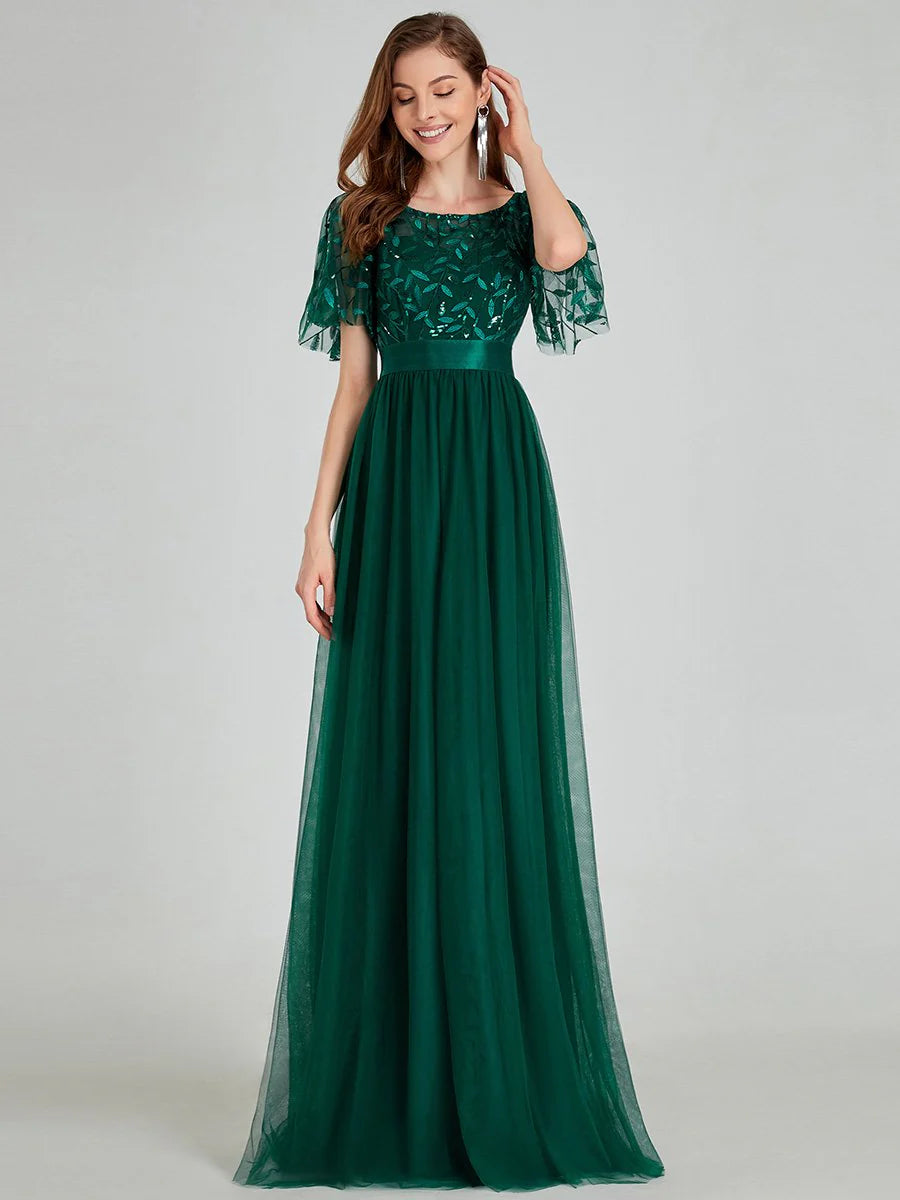 Sequin Print Maxi Long Evening Dresses with Cap Sleeve