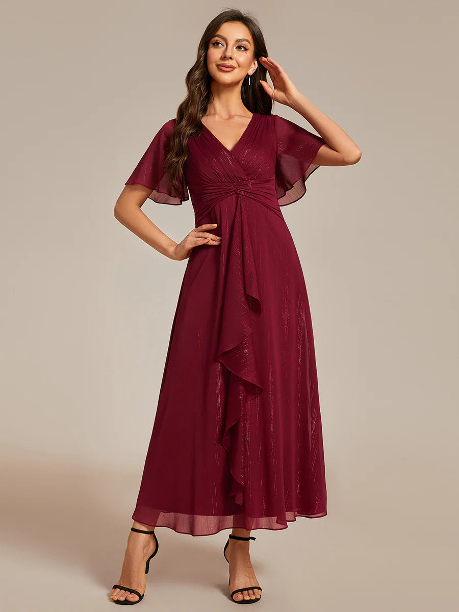Plus Shimmer V Neck Tea Length Wedding Guest Dress With Short Sleeves