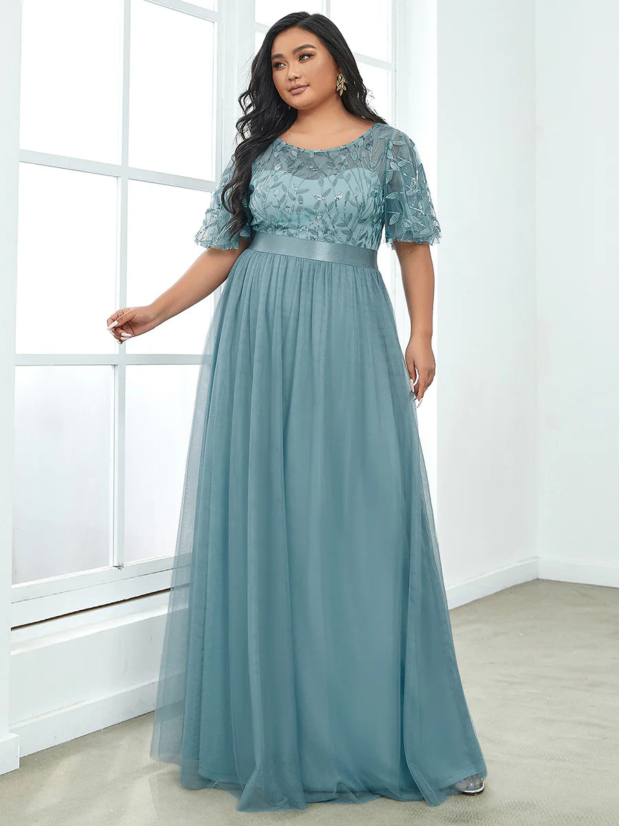 Sequin Print Plus Size Evening Dresses with Cap Sleeve