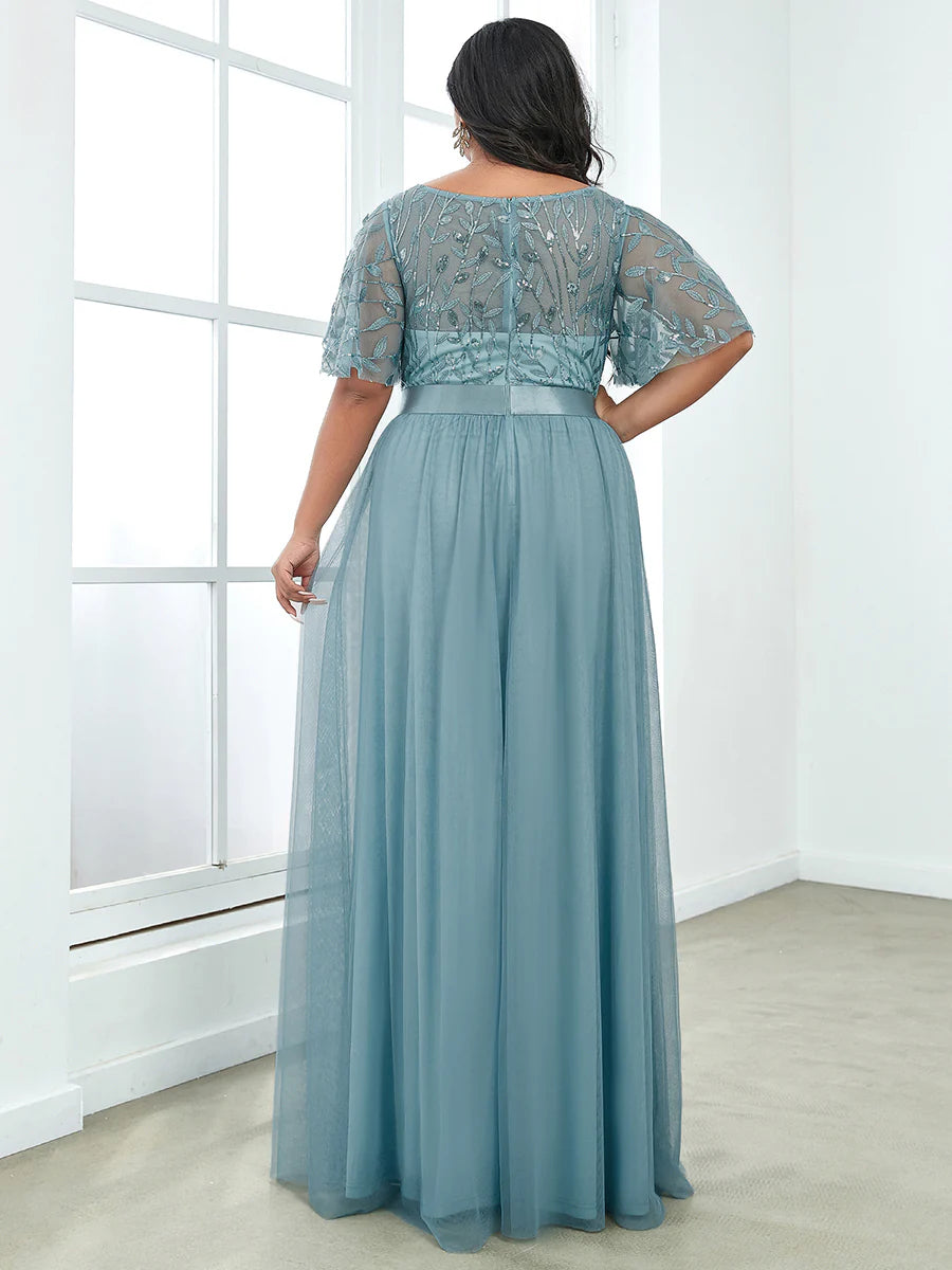 Featuring a classic round neckline, ruffle sleeves and a belt design in the waist, this stunning bridesmaid dress is perfect for any wedding. The shimmery leave design also gives a romantic vibe. The plus size dress is perfect for parties, cocktail, prom, homecoming, graduation, weddings, and any other formal affair!