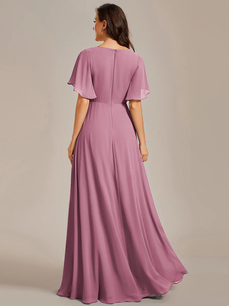Elegant V-neck, intricate lace appliques, and stunning pleated design. Wholesale price, perfect choice for bridesmaids.
